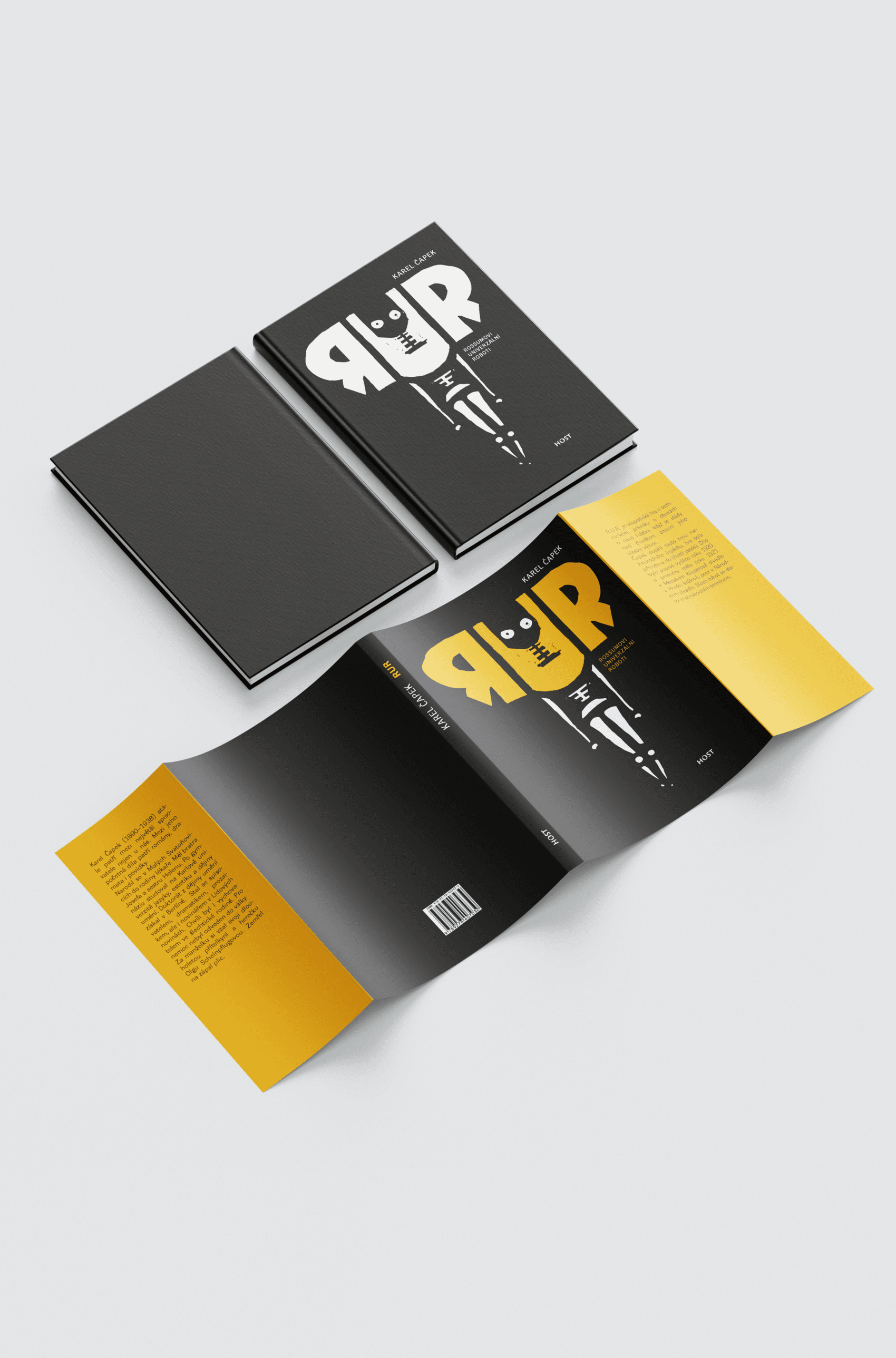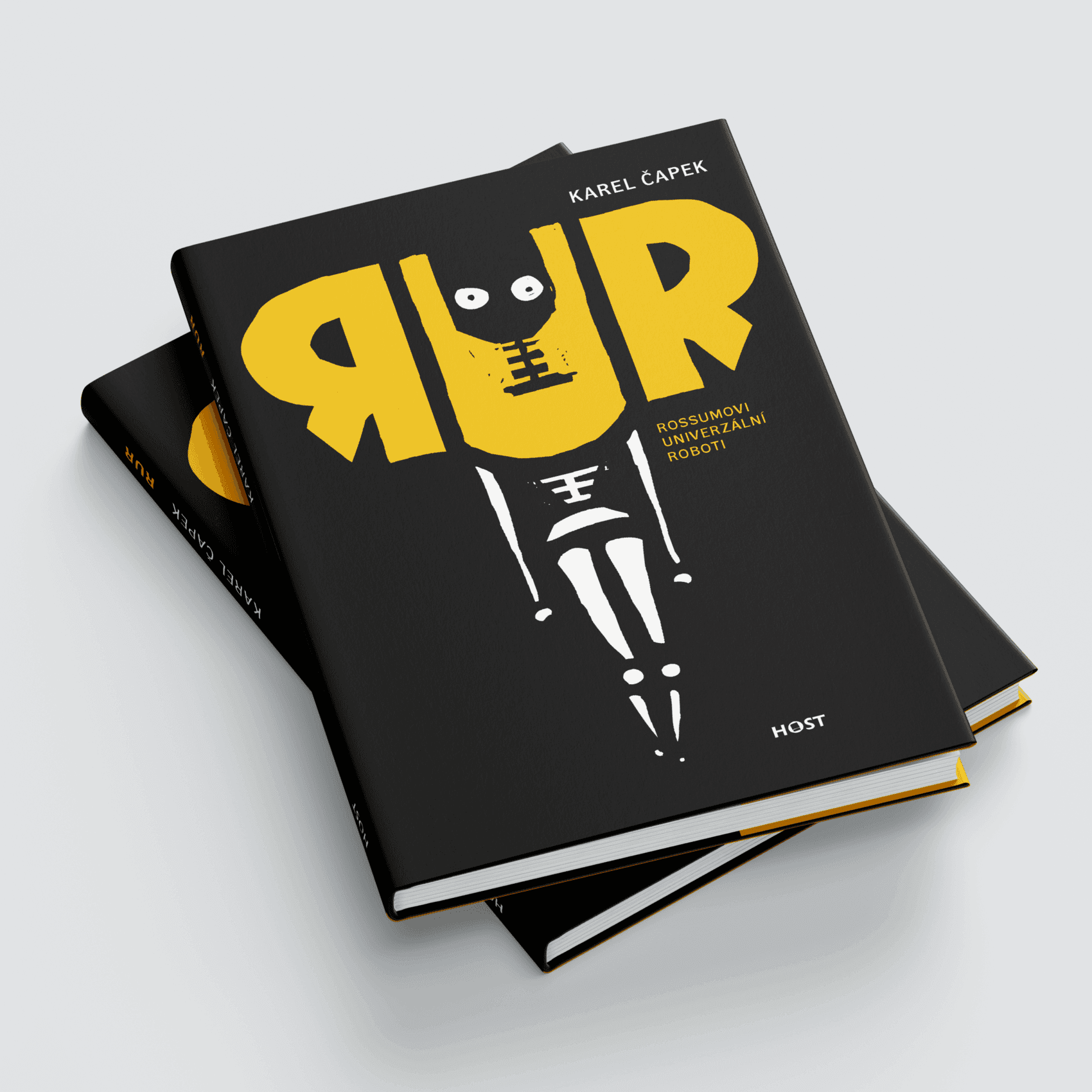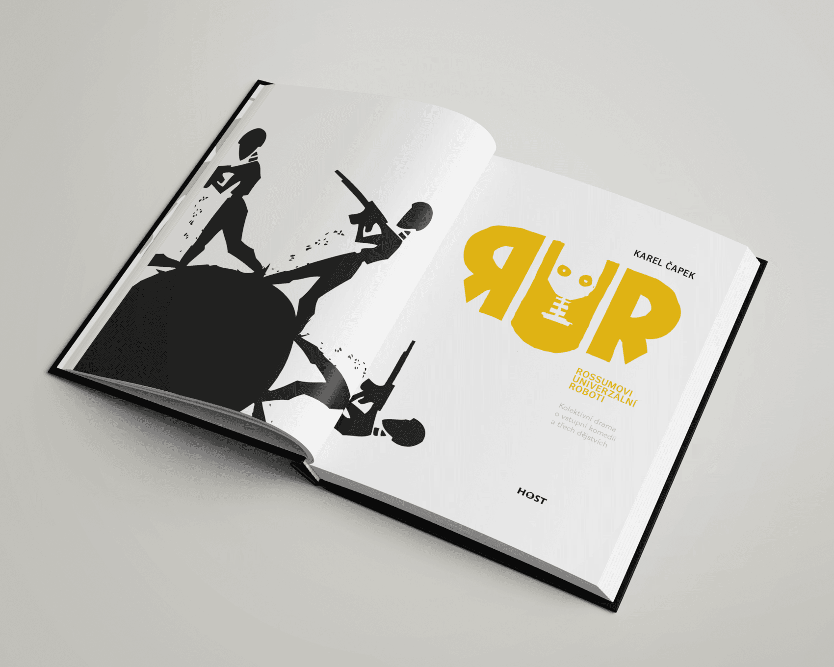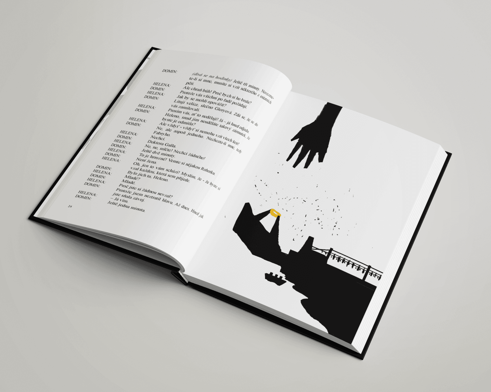 Pro obálku jsem využila symetrii názvu a negativní prostor u písmene „U“ jsem vyplnila hlavou robota. Použila jsem hrubší styl grafiky, jako by byly plochy vyryté linorytem (proto i drobné tečky kolem kreseb, připodobňující nedostatečně vyhloubenou plochu lina, která se při tisknu obtiskne na papír). Tento vzhled pak převzaly i vnitřní ilustrace.