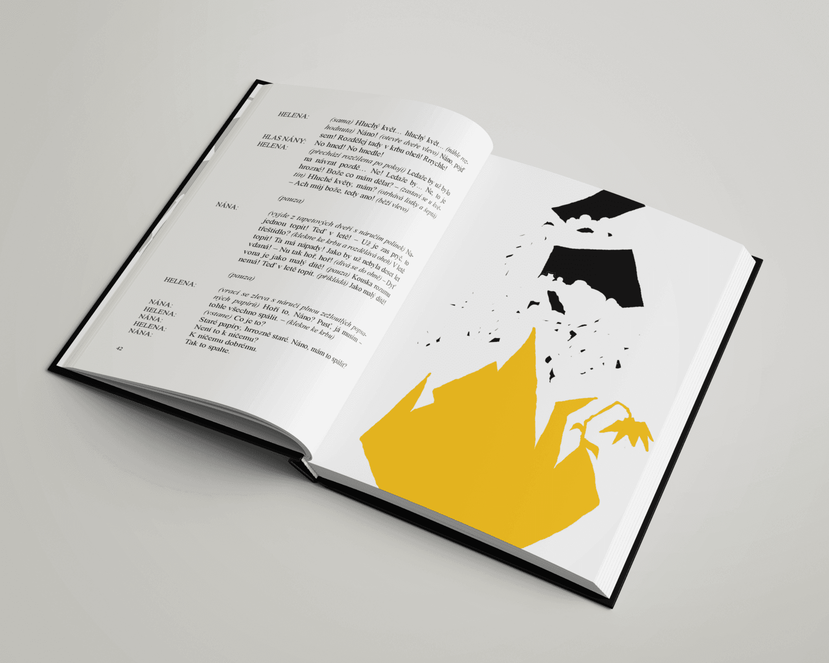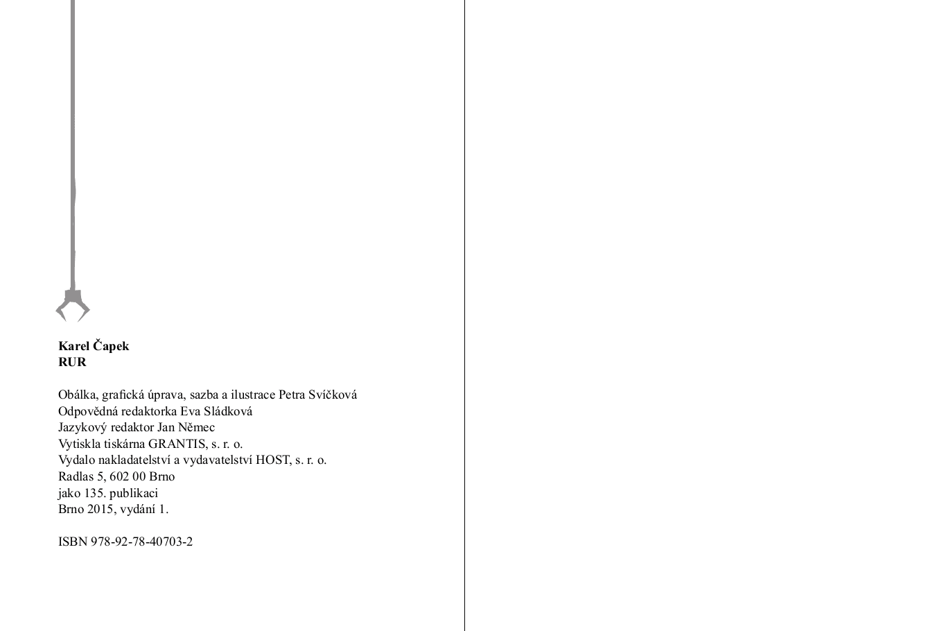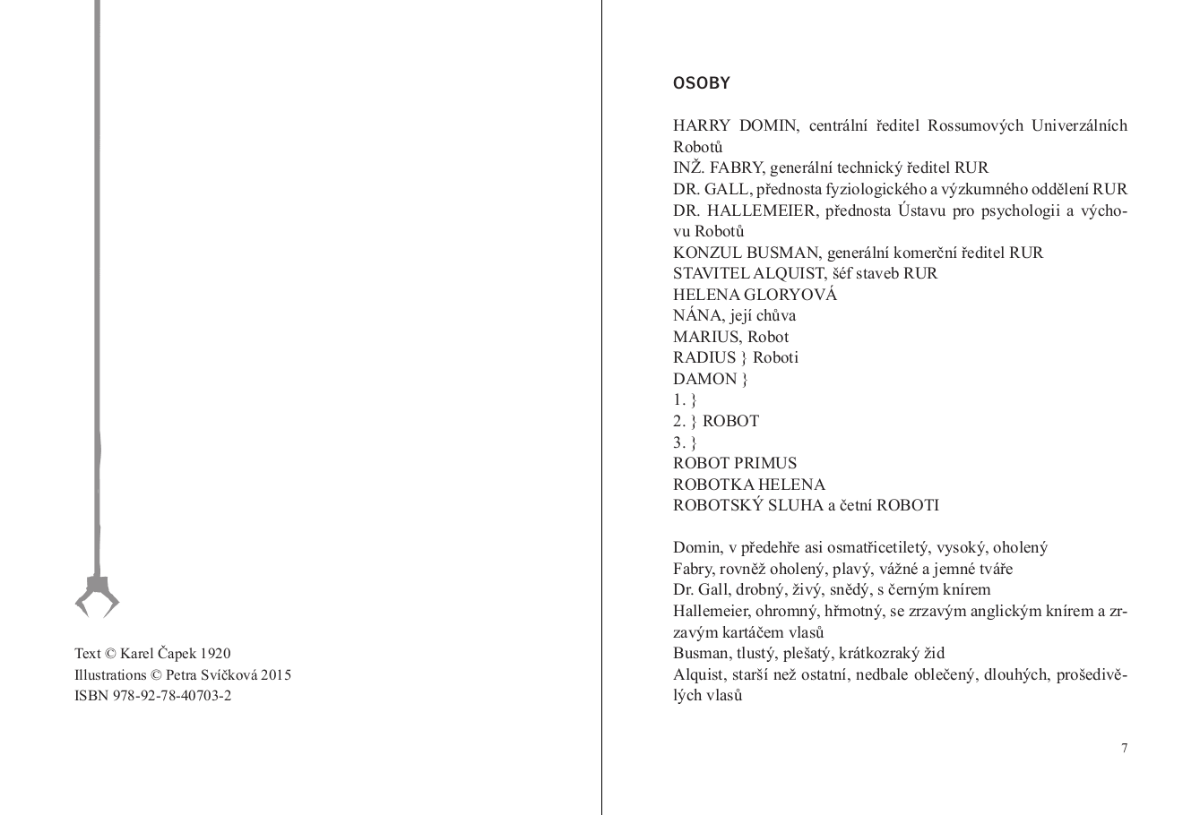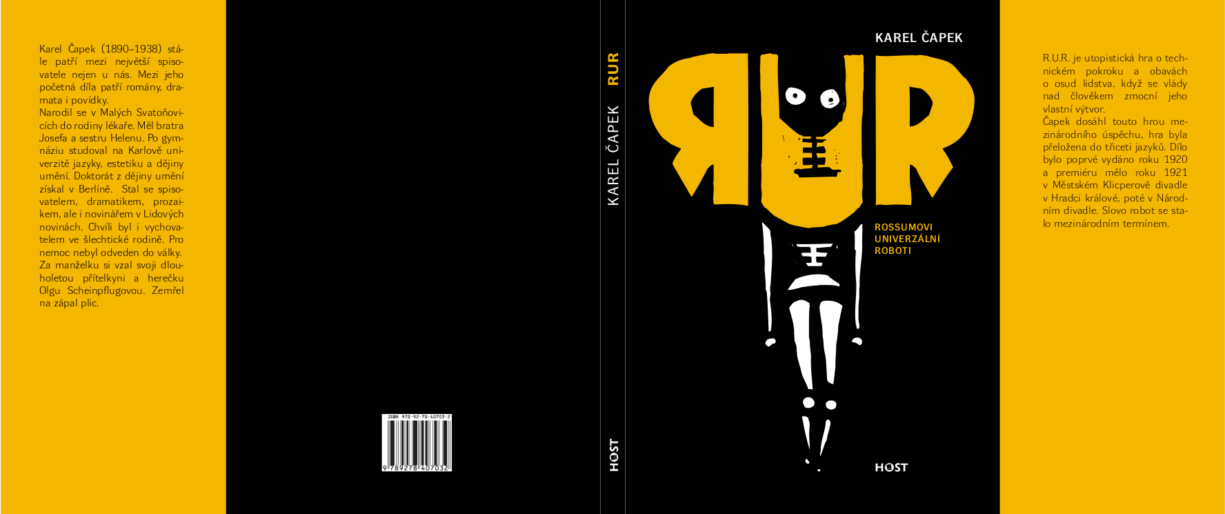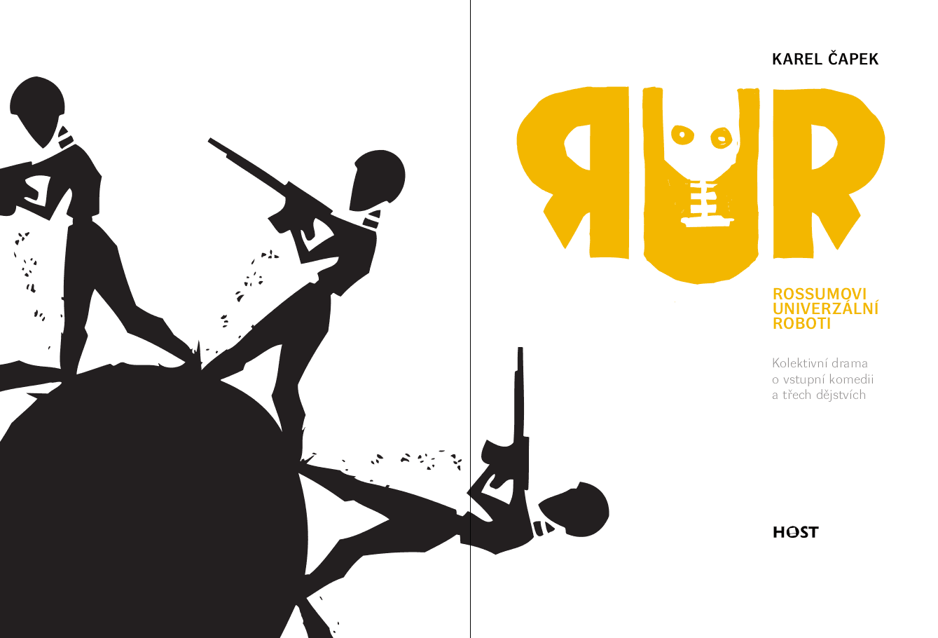 Pro obálku jsem využila symetrii názvu a negativní prostor u písmene „U“ jsem vyplnila hlavou robota. Použila jsem hrubší styl grafiky, jako by byly plochy vyryté linorytem (proto i drobné tečky kolem kreseb, připodobňující nedostatečně vyhloubenou plochu lina, která se při tisknu obtiskne na papír). Tento vzhled pak převzaly i vnitřní ilustrace.