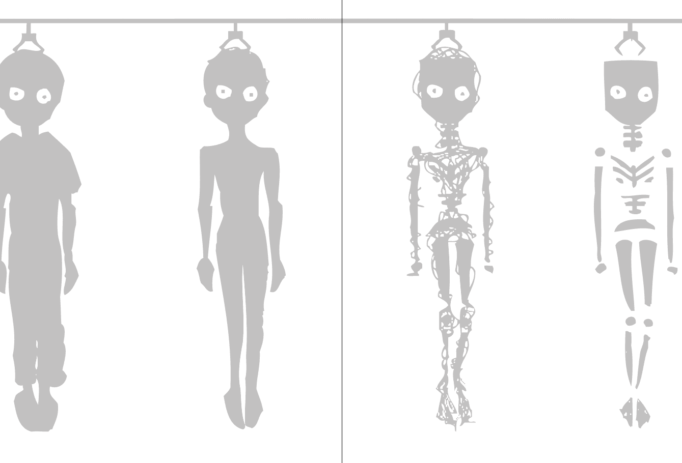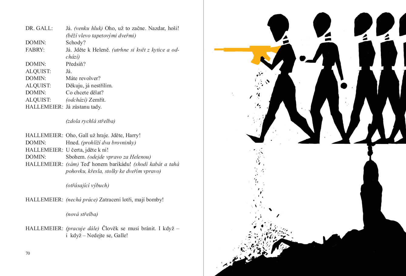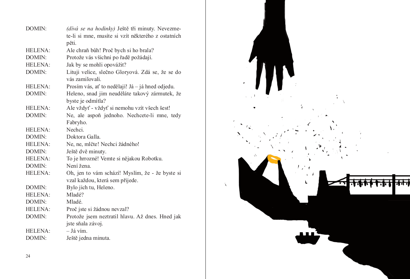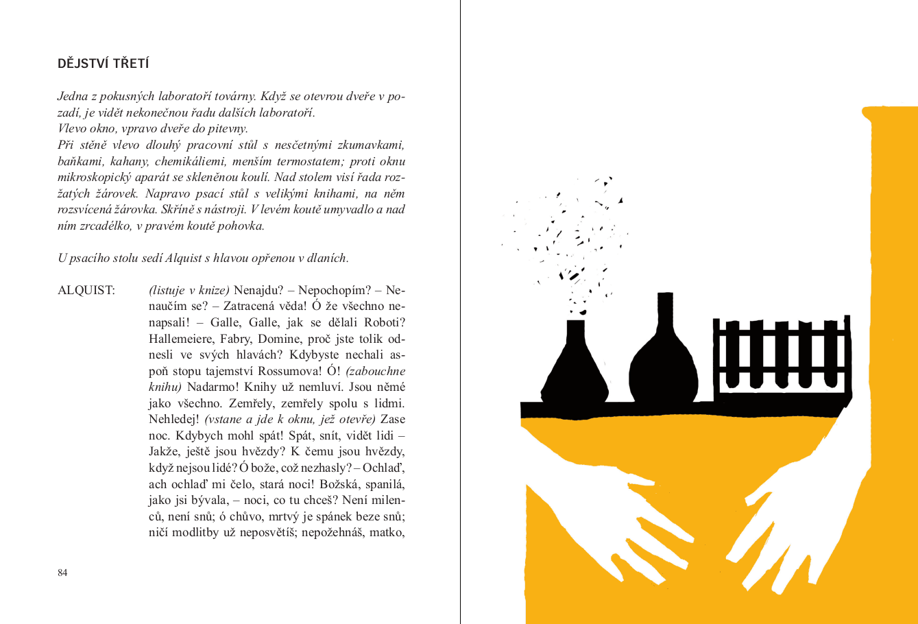 Pro obálku jsem využila symetrii názvu a negativní prostor u písmene „U“ jsem vyplnila hlavou robota. Použila jsem hrubší styl grafiky, jako by byly plochy vyryté linorytem (proto i drobné tečky kolem kreseb, připodobňující nedostatečně vyhloubenou plochu lina, která se při tisknu obtiskne na papír). Tento vzhled pak převzaly i vnitřní ilustrace.